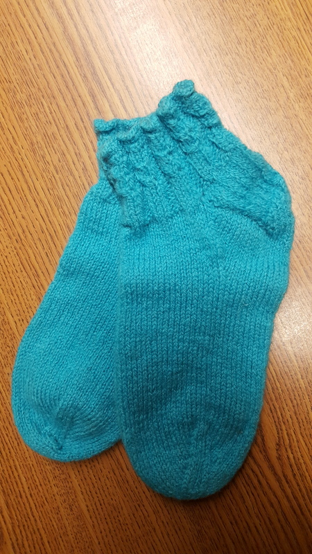 I knit the socks according to a template I made on cardboard of Jule’s foot. Sock #1 was huge. I mean, loose on me and I am an 8.5! When I completed the second sock, it was equally huge. I could not bear to rework these, so I hoped that the blocking process would resolve some of the problem. It did not. So, here is what I did to produce the adorable socks you see in the photos…