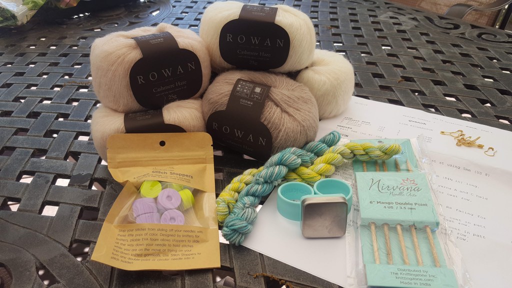 This is the Rowan “Quench” Kit. It includes 8 balls of Rowan Cashmere Haze and the pattern for Lisa Richardson’s stunning tri-color scarf by the same name. I also receive a bag of mixed stitch stoppers and a Maker’s Keep both by Cocoknits, and a set of Nirvana Mango dpns. This is a new-to-me brand and I look forward to knitting with them.