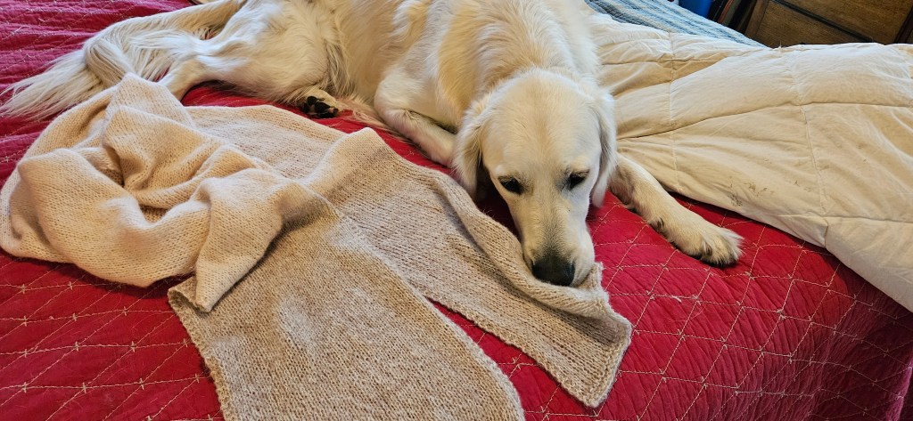 Carver is getting better around my knits and it’s a good thing; there was a time when he could not be in the same room with any yarn. Look at that good boy!