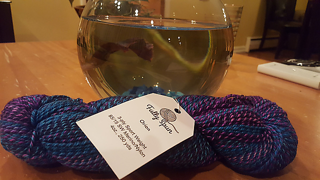 I went deep diving into stash for this wool. Techno, by Blue Sky Fibers, is considered a blown fiber. It unique construction consists of baby alpaca blown into a mesh tube of silk. It looks like single ply but without the spitting. Imagine whole lotta soft, spun into a tube, filled with fluff, then wrapped in a cloud. It’s like that; bulky but light, soft and cozy warm. The hat and mittens were knit with two strands held together. Notice the pom-pom? I am getting wise in my old age. This in no way resembles a tennis ball, therefore the little terrorist leaves it alone. Good Carver! I am not sure why the ribbing looks so wonky. Good thing I’ll be tucking that in my coat.