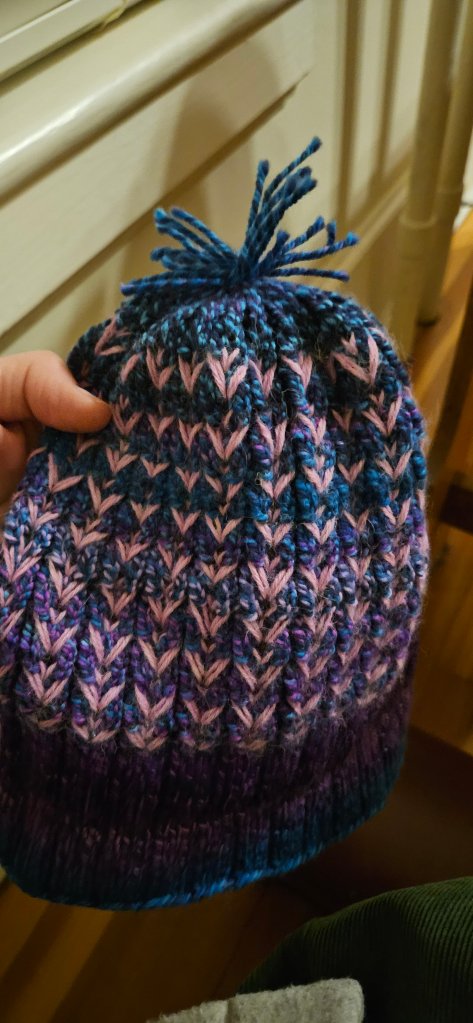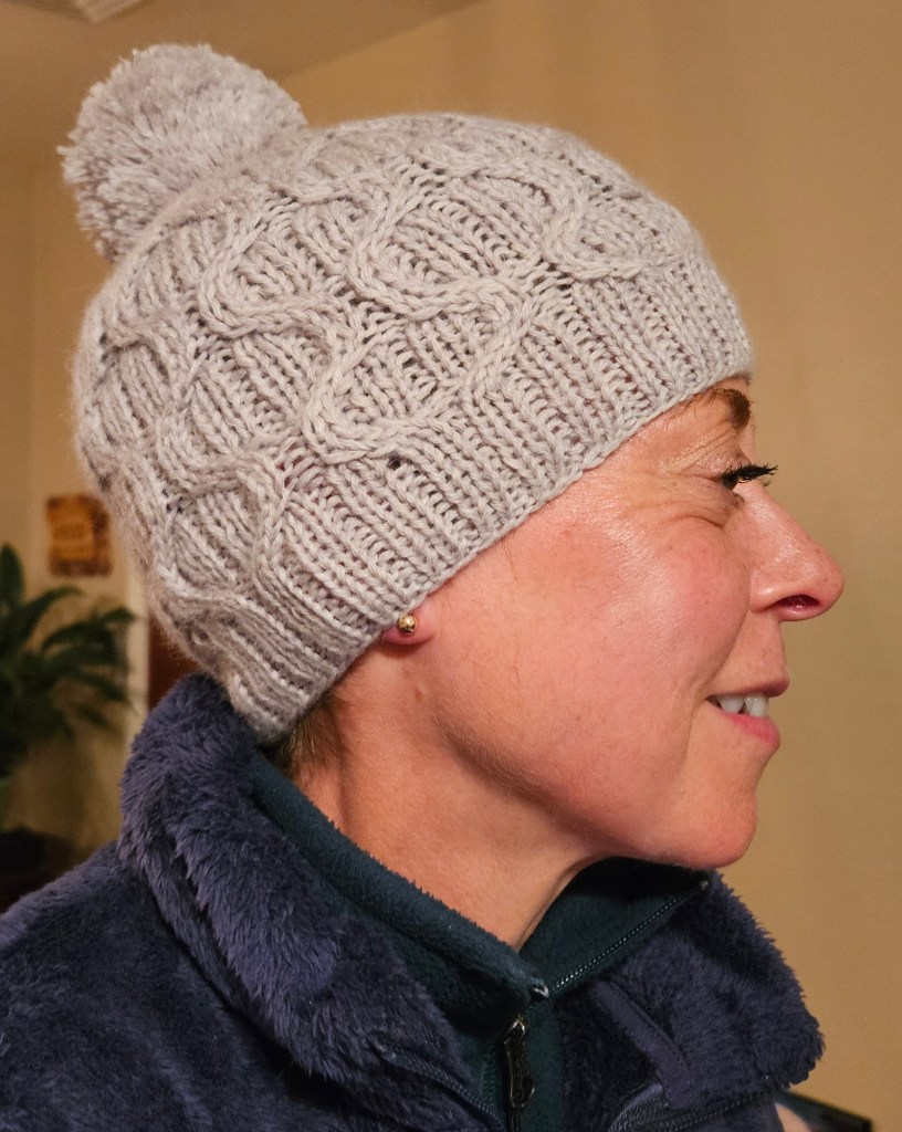 Another project recently off the needles is the Snowglobe Hat by Tin Can Knits. Knit with a strand of The Knitting Goddess BFL and that versatile Baby Alpaca mentioned above, this hat was a fun and fast knit. The pattern was easy enough to memorize. If you decide to knit one for yourself, read the pattern through before casting on. The designers create the crown decreases in pattern. It is that attention to detail that makes this a keeper. This hat is a gift for my beautiful sister!